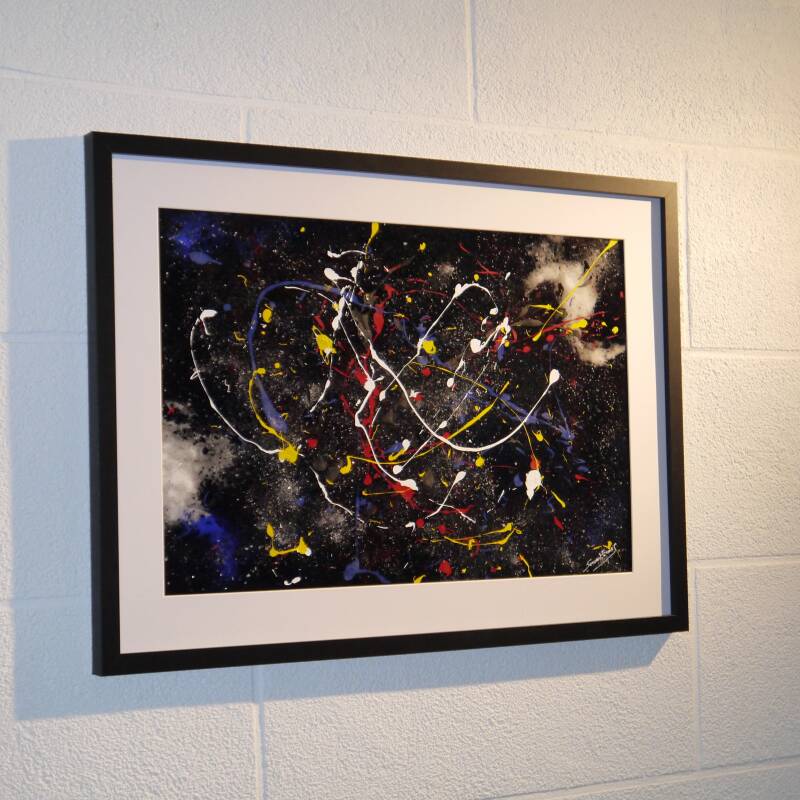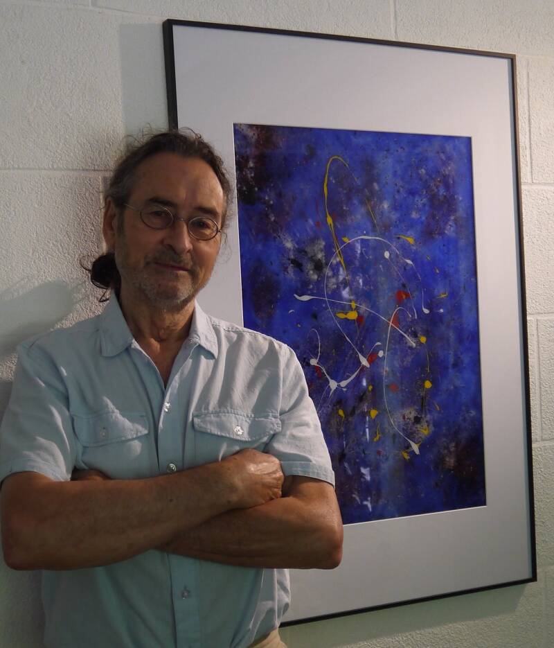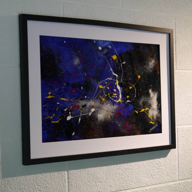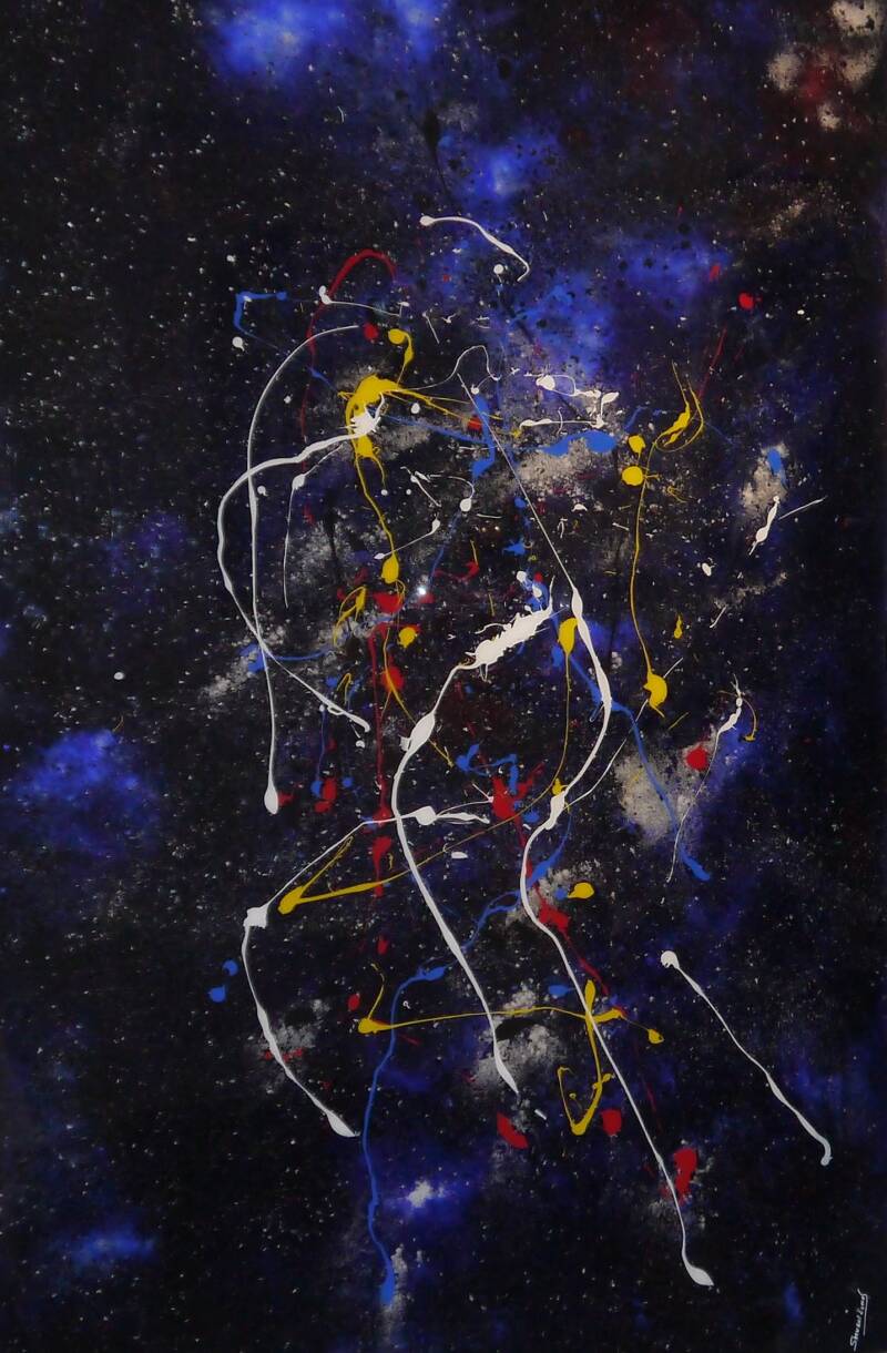 With Cosmo-Quantum Art, Servant Ermes brings things full circle: his work represents the culmination of an approach that is simultaneously artistic, scientific, and technical—a true synthesis of his journey. The background reveals the Universe, the infinitely vast; in the foreground, the infinitely small: the elementary particles, reflecting the founding principle of his quantum art. Five pure colors, never mixed, embody the five particles at the origin of atoms and life. The piece combines varnish, pigments, meteorite dust, and various mineral materials to create a unique substance bridging sky and matter.